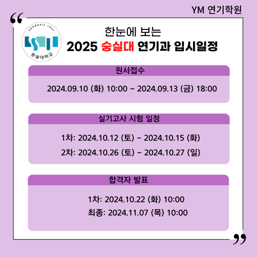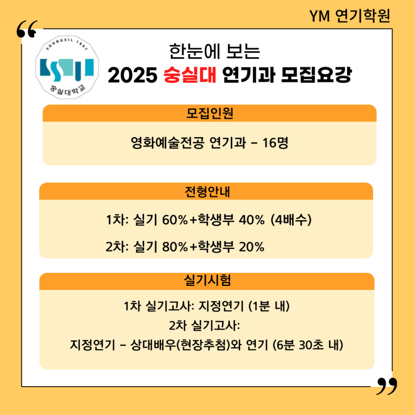 [YM연기학원] 2025학년도 숭실대 영화예술전공 연기과 시험일정/모집요강