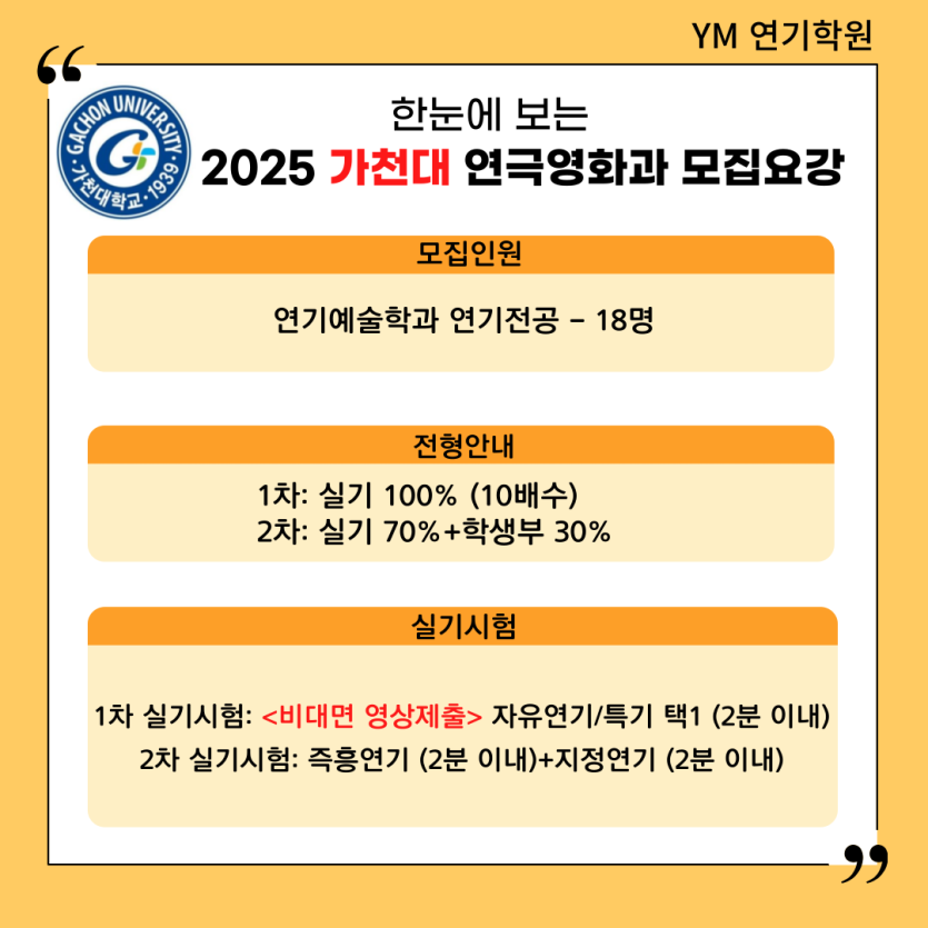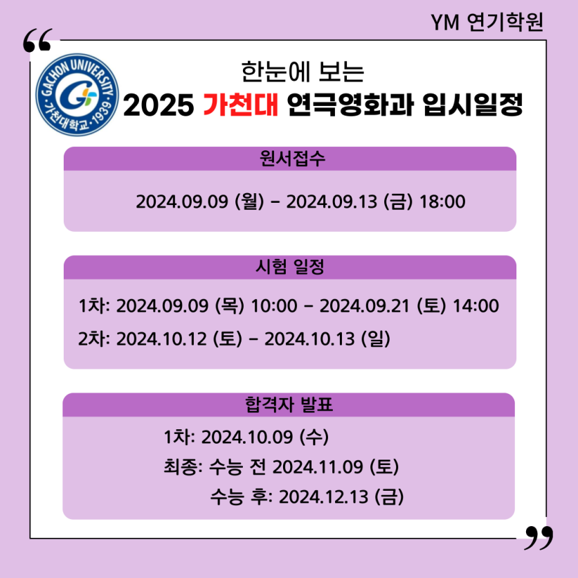 [YM연기학원] 2025학년도 가천대학교 연기예술학과 시험일정/모집요강