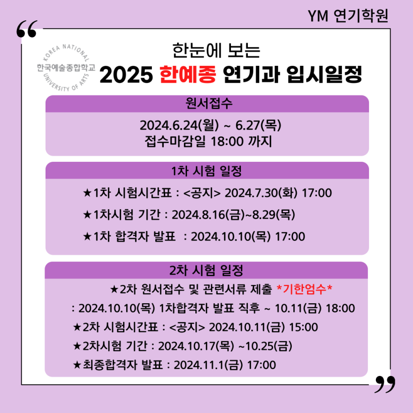 [YM연기학원] 2025학년도 한예종 연극원 연기과 시험 일정
