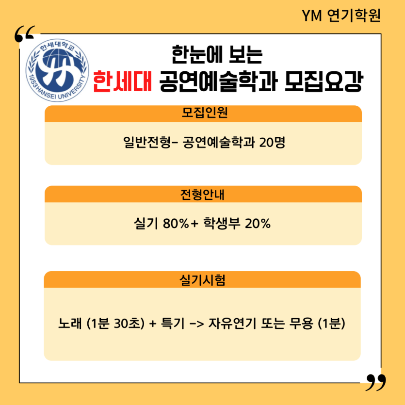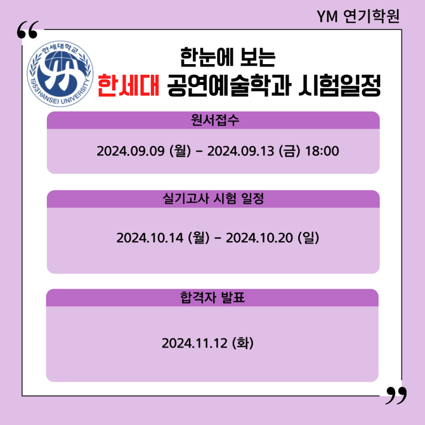 [YM연기학원] 2025학년도 한세대 공연예술학과 시험일정/입시요강